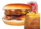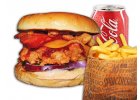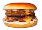 200g hovězí maso, grilovaná červená cibule, slanina, ledový salát, dresing, vejce.