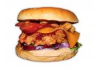 Houska, dresink, cibule, salát, kuřecí steak, sýr, slanina, barbecue omáčka, cibulové půlkroužky